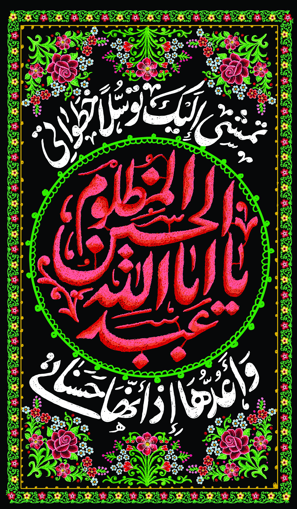 اللون الأحمر في قلب التصميم يرمز إلى مظلومية الحسين (ع) وتضحيته، بينما الإطار الأخضر يعبّر عن الأمل واستمرار الطريق. الزخارف الزهرية تضيف بعدًا بصريًا جميلًا يجعل هذه الراية مناسبة لغرفة الشاب، أو هيئة الشباب، أو أي مكان يريد فيه أن يعلن انتماءه لطريق الحسين.