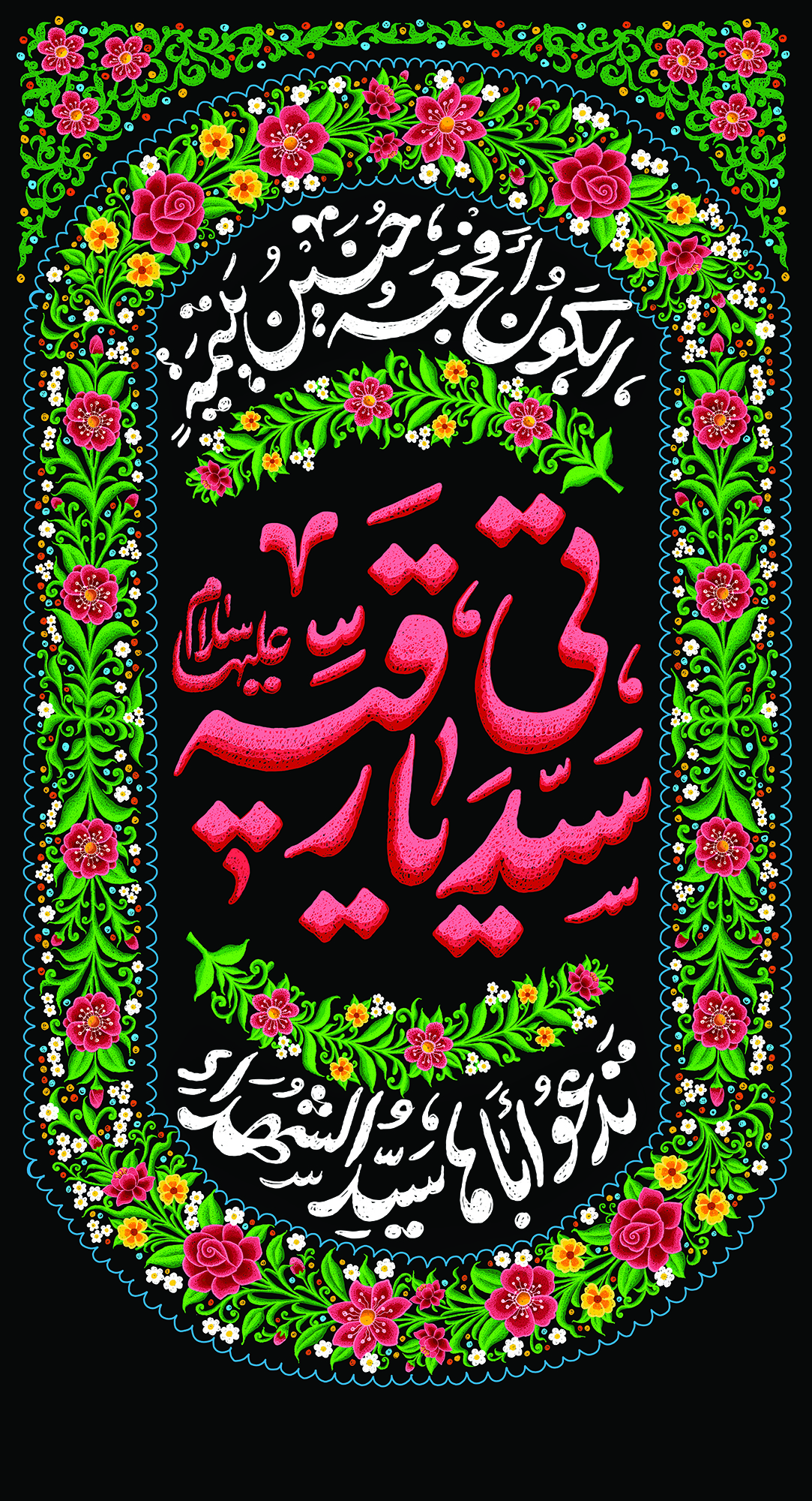 هذه الراية المخملية تحمل حكاية حزنٍ نقيّ، حزن طفلةٍ صغيرة اسمها رقية (عليها السلام)، بلغة قريبة من قلب الطفل والمراهق. عبارة «سيدتي يا رقية عليها السلام» مع هذا البيت الشعري المؤلم، تنقل إحساس اليُتم والحنين إلى الأب، الإمام الحسين (ع)، بأسلوب بسيط لكنه عميق.